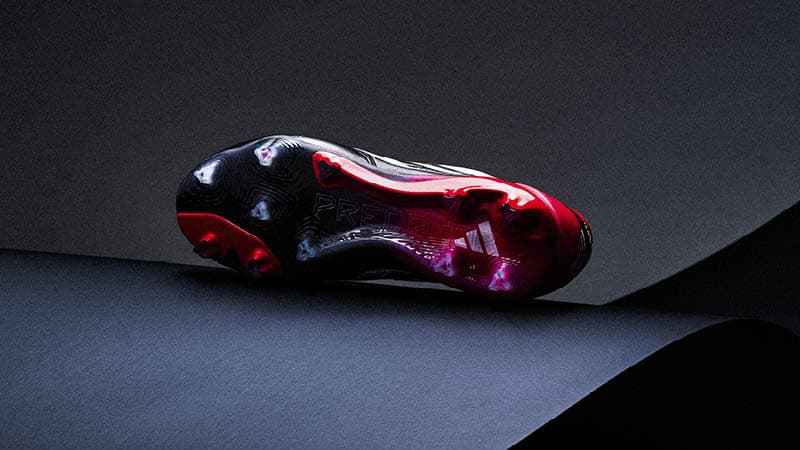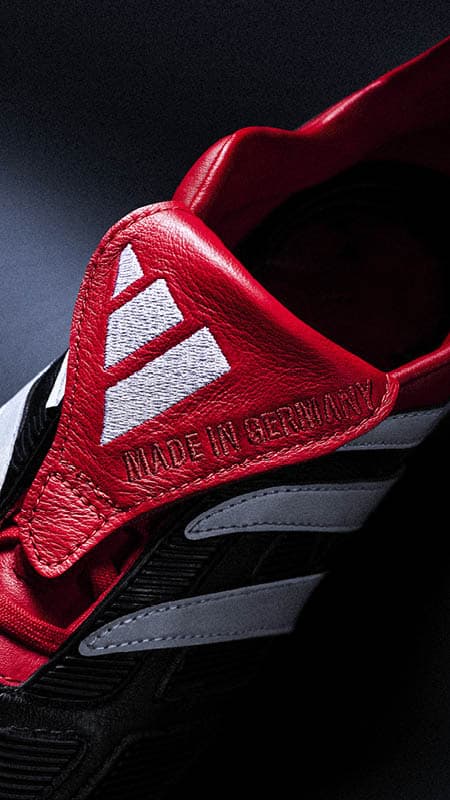 Le Predator Precision Origins se distingue par son upper dominant en noir, rehaussé de détails rouges sur le contrefort du talon et la languette rabattable iconique. Les trois bandes blanches d’Adidas, qui s’estompent subtilement vers le talon, apportent une touche d’élégance et de fluidité au design. L’emblème Adidas apparaît en blanc sur la languette, le contrefort et la semelle, tandis qu’une inscription embossée « Made in Germany » en rouge sur la languette souligne fièrement l’artisanat et l’héritage de la marque. Ce pack est une véritable résurrection du Predator Precision, rappelant pourquoi cette ligne est devenue la famille de crampons la plus légendaire du football – un mélange parfait d’héritage et d’innovation.